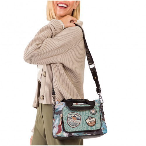 RAMENNÝ POPRUH JE NASTAVITEĽNÝ DO RÔZNYCH DĹŽOK, IDEÁLNY NA PRISPÔSOBENIE VÝŠKE, KTORÚ PREFERUJETE. VNÚTRO JE PODŠITÉ ORIGINÁLNOU VZOROVANOU LÁTKOU S MOTÍVMI Z KOLEKCIE, MÁ VRECKÁ.